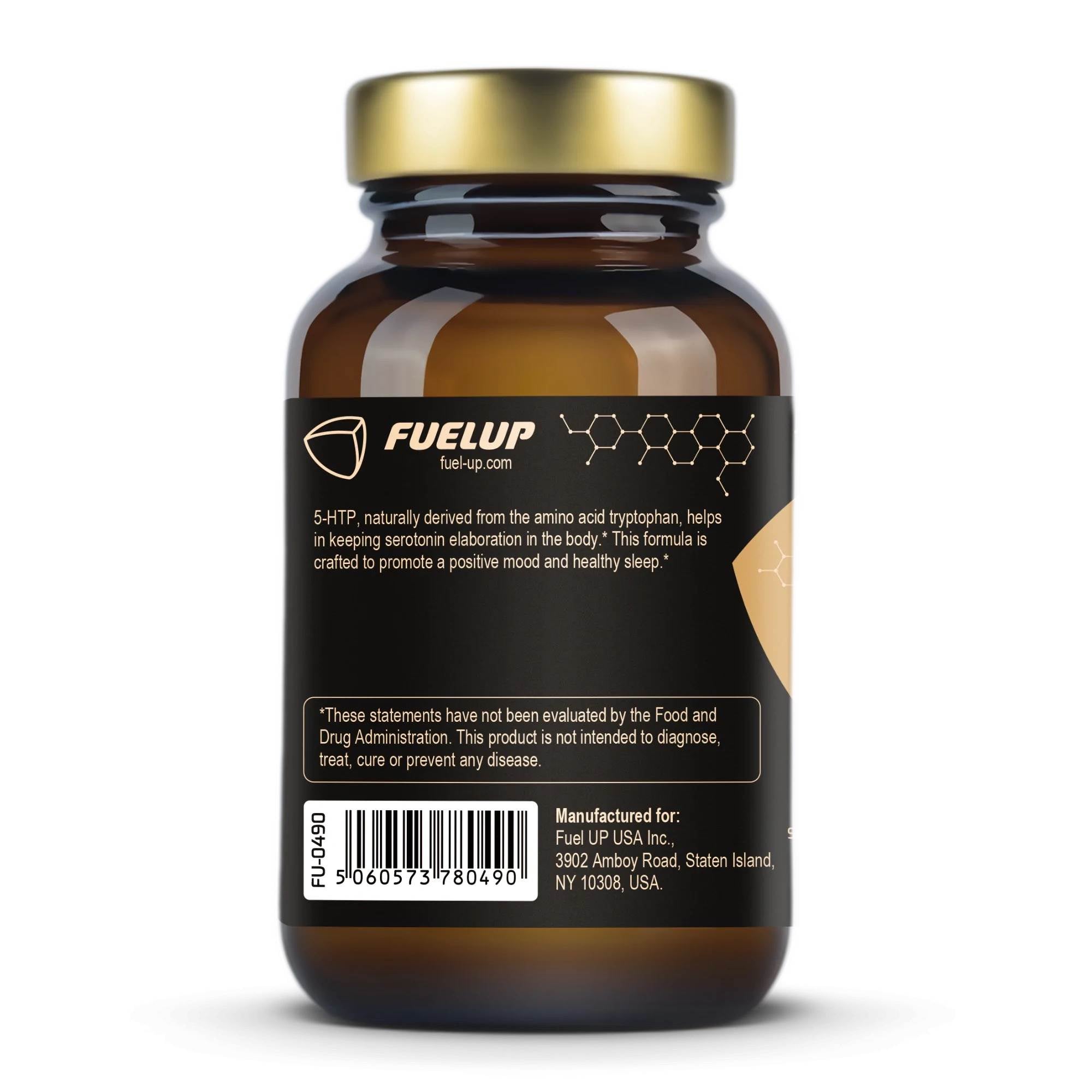 Jede Fuel Up-Dose enthält 60 Kapseln mit jeweils 100 mg hochwirksamem 5‑HTP.